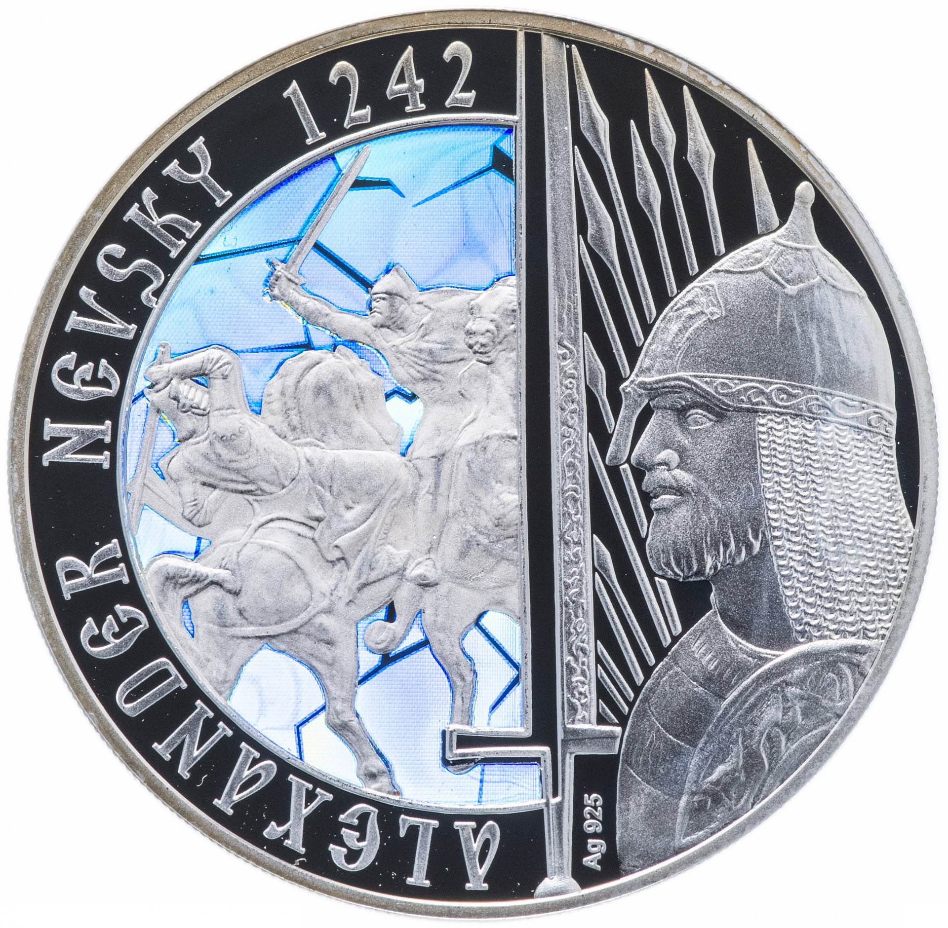 Опис: Сцена з битви на льоду, яка відбулася 5 квітня 1242 року на озері Пейпус між Новгородською республікою на чолі з князем Олександром Невським та військами Лівонського ордену і Дорпатського єпископства на чолі з єпископом Германом Долпатським.