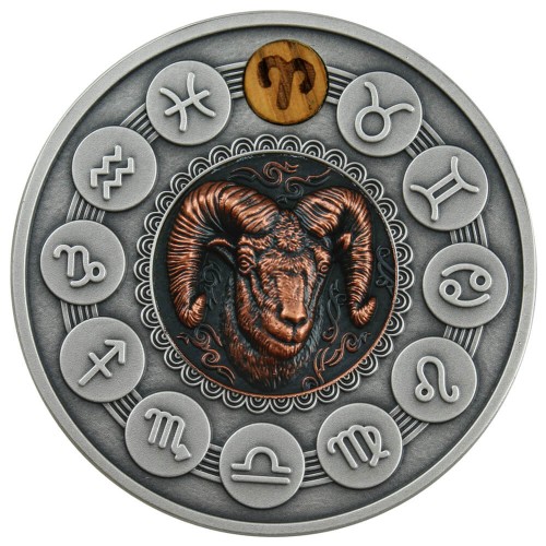 Опис: У центральній частині монети – зображення Овна. Зверху – символи всіх знаків зодіаку, символ Овна позначений дерев'яною вставкою. По краю, вздовж обідка – декоративні візерунки.