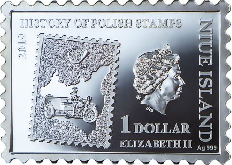 Опис: У центральній частині монети — стилізоване зображення поштової марки з контуром Другої Польської Республіки, поштового візка 1920-х років та поштового рогу. У нижньому лівому куті — портрет Її Величності Королеви Єлизавети II.