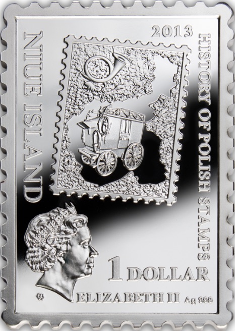 Опис: На аверсі в центральній частині монети – зображення поштового воза 19 століття. На тлі – контури кордонів Польського Королівства. Праворуч – назва серії англійською мовою.