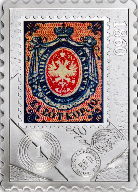 Опис: На звороті — зображення поштової марки, виконане за допомогою багатоколірної технології тамподруку. Додатково — історичні конверти та поштовий штемпель 1860 року.