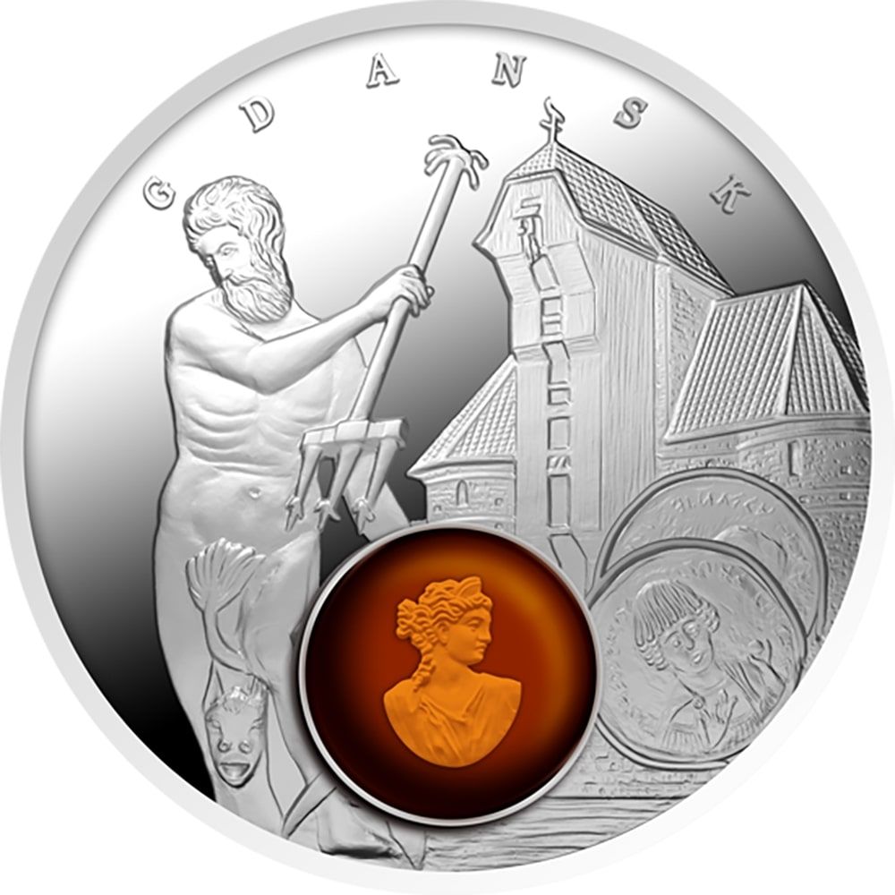 Опис: Визначні пам'ятки Гданська та римська монета, якою в ті часи розраховувалися за бурштин. Також є невелика скульптура з бурштину, виготовлена за технікою інтагліо-рельєфу.