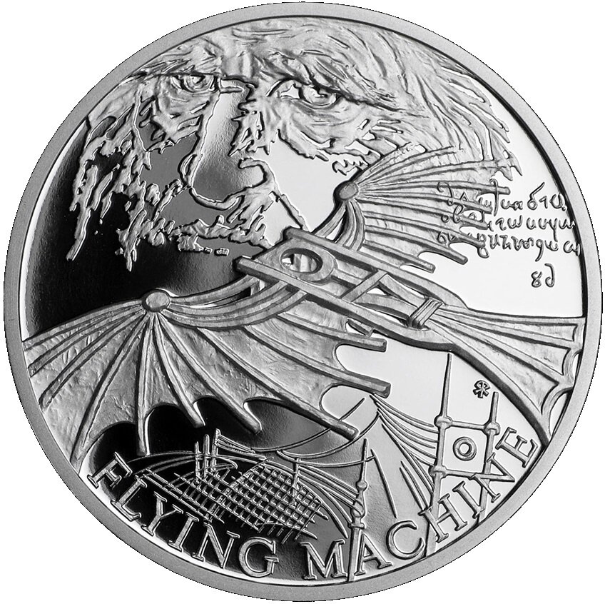 Опис: Компонування планера, натхненне щоденниками Леонардо. Леонардо да Вінчі зображений у верхній частині монети.