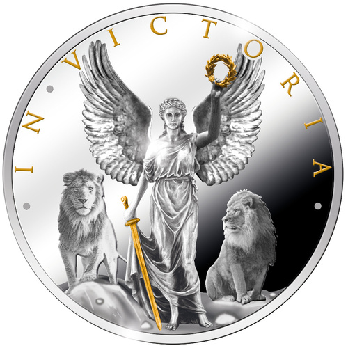 Опис: Зображення жінки з крилами та лавровим вінком — це Вікторія, римська богиня, яка уособлює перемогу. Лев символізує мужність, а опущений меч не закликає до атаки, а сповіщає про завершення завдання.