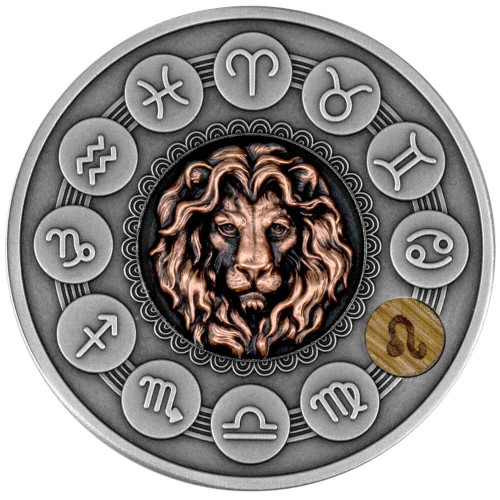 Опис: У центральній частині монети — зображення Лева. Зверху — символи всіх знаків зодіаку, символ Лева позначений дерев'яною вставкою. По краю, вздовж обідка — декоративні візерунки.