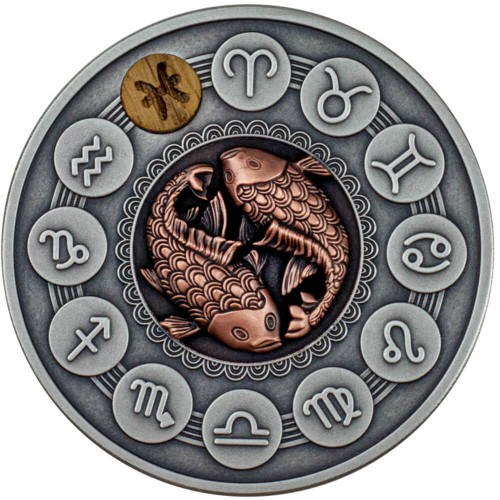 Опис: У центральній частині монети — зображення Риб. Зверху — символи всіх знаків зодіаку, символ Риб позначений дерев'яною вставкою. По краю, вздовж обідка — декоративні візерунки.