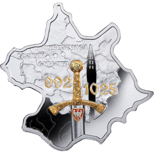 Опис: Зображення коронаційного меча з датами правління Болеслава Хроброго (992 – 1025). Зверху – назви двох столичних міст-замків та міста проживання династії Пястів: Познань, Гнєзно та Крушвіца.