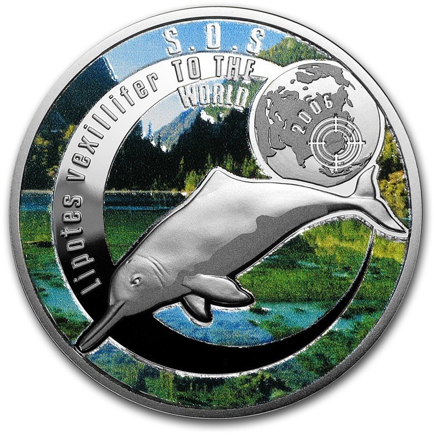 Опис: У центрі монети зображено рельєфне зображення річкового дельфіна, байджі, який колись мешкав у середній та нижній течії річки Янцзи. Нижче вказано рік, в якому вид був класифікований як вимерлий, та карта з позначеною територією поширення виду, створена за допомогою лазерної техніки.