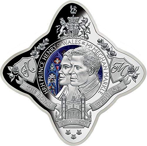 Опис: Дизайн цієї монети зосереджений на вигравіруваному портреті щасливої пари, розташованому перед прекрасними вітражами каплиці Святого Георгія в Віндзорському замку. Вказані ініціали H&M, всередині щитів, а також дата весілля. Інші символи королівської влади, включаючи троянду Англії, зовнішній вигляд каплиці Святого Георгія у Віндзорському замку та герб Великої Британії з левом і єдинорогом, вигравірувані у складній техніці.