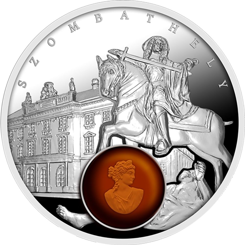 Опис: Визначні пам'ятки міста Сомбатхей та невелика бурштинова скульптура, виготовлена за допомогою техніки інтагліо-рельєфу.