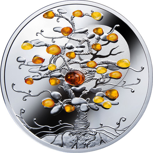 Опис: У центральній частині монети – бурштинові камені, зображення Дерева щастя (рельєф, цифровий друк, вибіркове мідне покриття). На тлі – стилізована декоративна поверхня: сонце (лазерне матування).