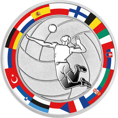 Опис: Силует волейболіста на стилізованій декоративній поверхні — волейбольний м'яч. По краю — кольорові прапори країн, що беруть участь у чемпіонаті Європи з волейболу 2017 року.