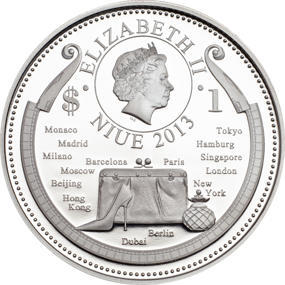 Опис: Зображення королеви Єлизавети II праворуч у внутрішньому колі, дата нижче, п'ятнадцять назв міст та модних предметів нижче кола.