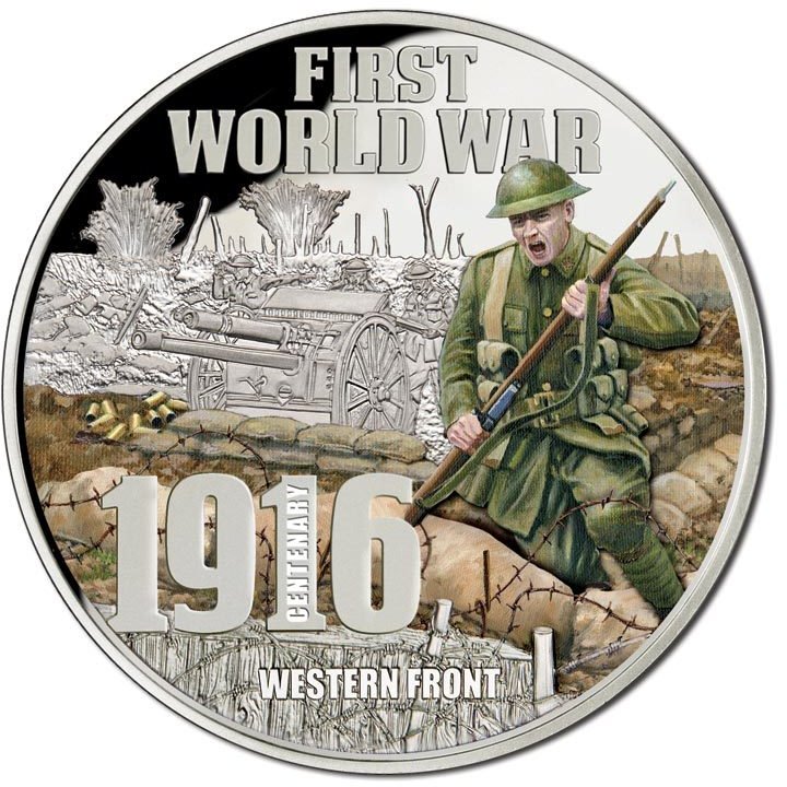 Опис: Сцена однієї з битв, що відбулася в 1916 році на західному фронті: солдати з піднятими руками атакують окопи, на задньому плані видно гармату, навколо якої розкидані уламки снарядів.