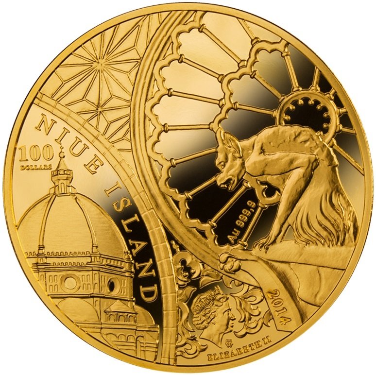 Опис: Зліва на монеті — купол базиліки Санта-Марія-дель-Фьоре у Флоренції. Справа — репліки однієї з розет і маскаронів, що прикрашають собор Паризької Богоматері. Внизу — профільний портрет Її Величності королеви Єлизавети II.