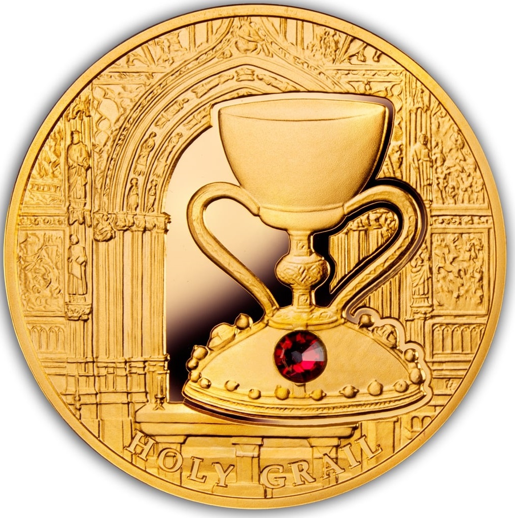 Опис: Святий Грааль Валенсійського собору — чаша, яка, за переказами, використовувалася Ісусом під час Таємної вечері. Реліквія була подарована собору королем Арагону Альфонсо V у 1437 році, але кам'яний келих з агату датується періодом між II століттям до н. е. та I століттям н. е. Тому на срібній монеті зображено орнамент із червоного агату. Золота монета прикрашена фіолетовим кристалом Swarovski, колір якого символізує страсті та смерть Христа.