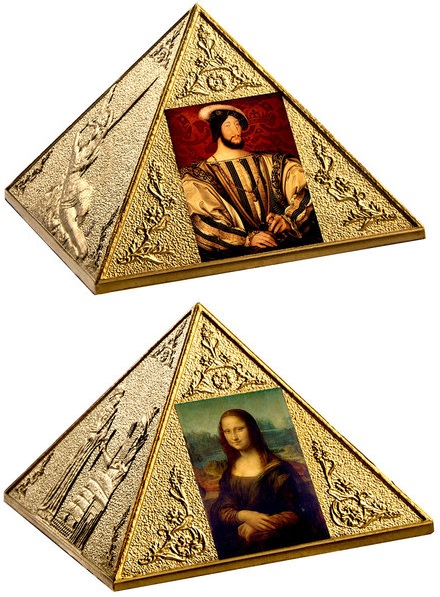 Опис: Піраміда з «Моною Лізою» Леонардо да Вінчі, «Франциском I» Жана Клуе, «Психеєю, оживленною поцілунком Купідона» Антоніо Канови та зображенням Кодексу Хаммурапі на кожній зі своїх граней