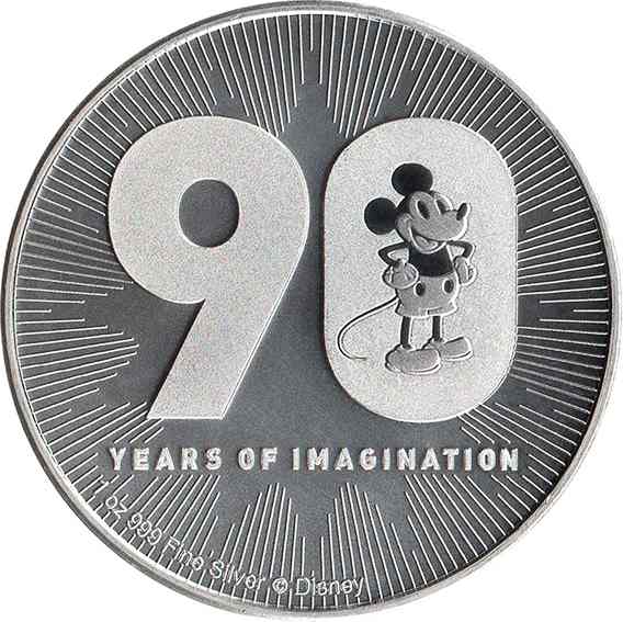 Опис: Рельєфне зображення сонячних променів з цифрою 90, вибитою великими жирними літерами, з гравіюванням Міккі Мауса всередині цифри «0» у цифрі 90.
