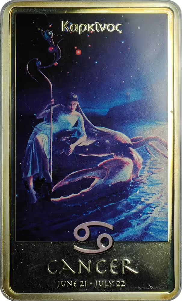 Опис: Коронований бюст Єлизавети II праворуч над номіналом, вагою та пробою металу, а також датою. Зовні навколо розміщені символи зодіаку.