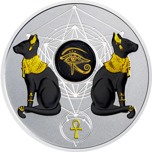Опис: У центральній частині монети – золотий камінь «Ніч у Каїрі», прикрашений символом Ока Гора. На тлі – орнамент. У нижній частині – єгипетський хрест анкх, символ життя. По боках – зображення котів.