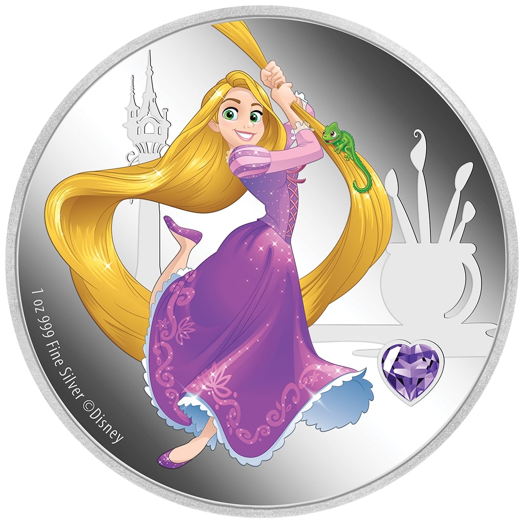 Опис: Рапунцель, яка грається зі своїми чарівними золотими локонами та хамелеоном Паскалем. На тлі вигравірувані її тюремна вежа та любов до мистецтва, представлена горщиком з пензлями.
