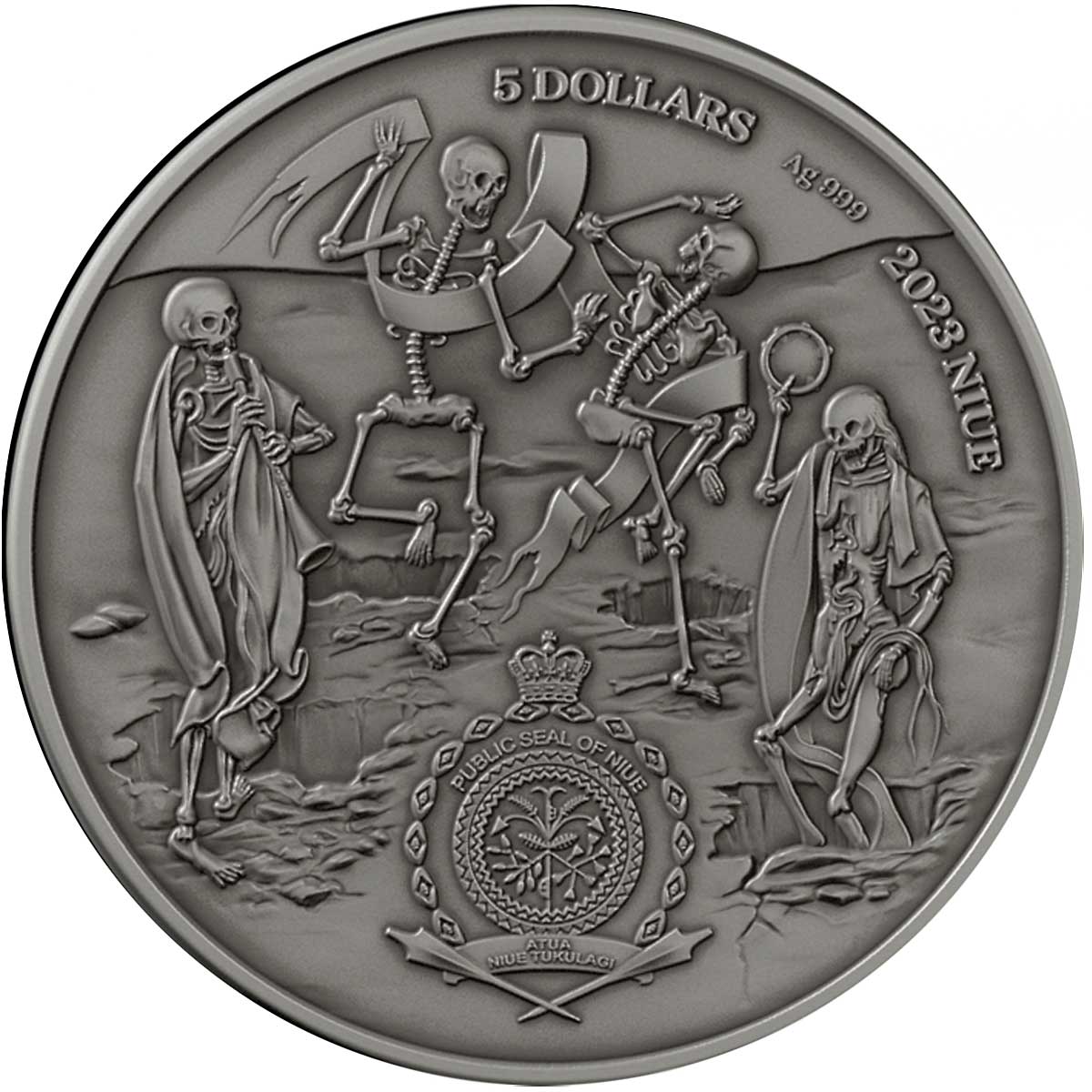Опис: Державна печатка Ніуе з макабричним зображенням — алегоричним танцем смерті, що виражає рівність усіх людей перед обличчям смерті.