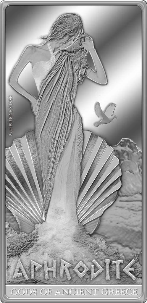 Опис: Драматичний момент народження Афродіти, коли вона з'являється з білої піни океану, викарбувано на срібній поверхні цієї монети. За нею видніється мушля, яка принесла її до берега, та острів, що увійшов у міфологію як місце її народження. Над цим зображенням голуб, священний для богині, летить по дзеркально-гладкому небу.