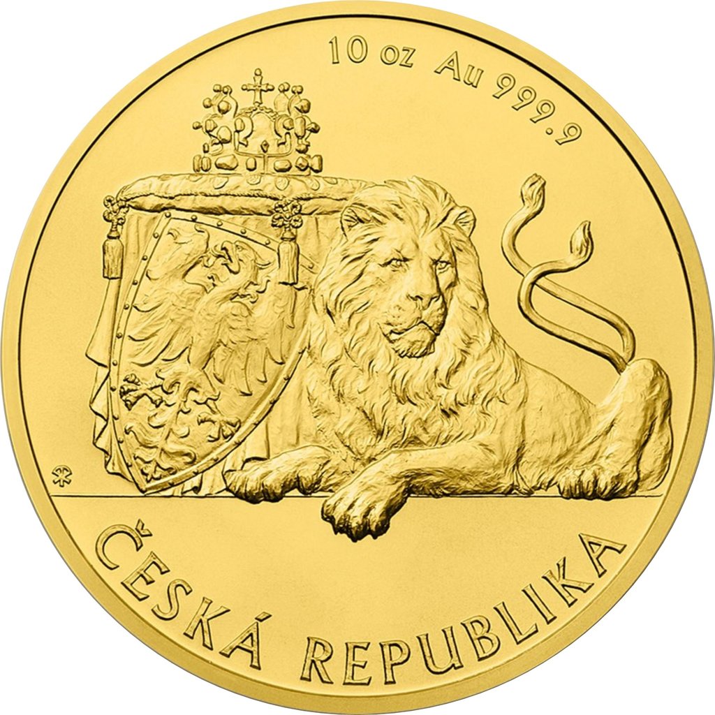 Опис: Зображення двохвостого чеського лева, який є гербом Чеської Республіки. Геральдична тварина охороняє вишукану корону Святого Вацлава та щит із емблемою національного покровителя — палаючим орлом.