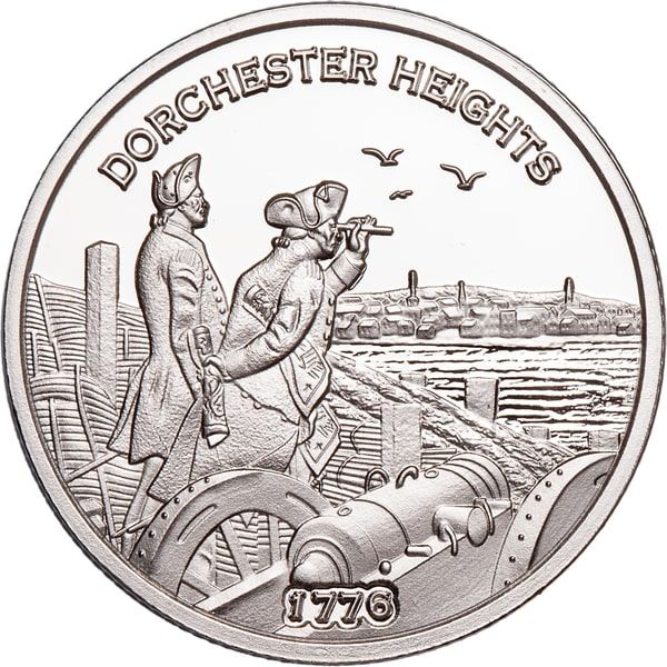 Опис: Джордж Вашингтон, що дивиться на Бостон, стоячи поруч із однією з гармат, які його війська привезли з форту Тікондерога