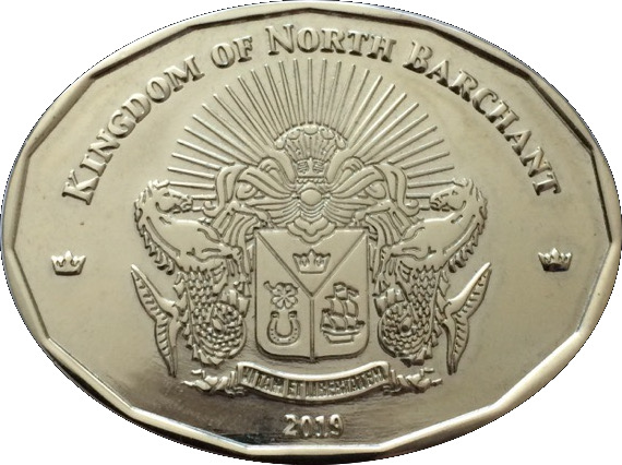 Опис: Дата Державний герб Королівства Північний Барчант. Герб являє собою зображення щита на тлі променів сонця, що сходить, з зображенням символів королівської влади – корони, вітрильних фрегатів та золотої підкови. З обох боків щит підтримують міфологічні морські коні. У нижній частині герба розміщено латинський напис «Vitam et libertatem», що вказує на принципи, якими керуються державні органи Королівства Північний Барчант, – «Життя і свобода».