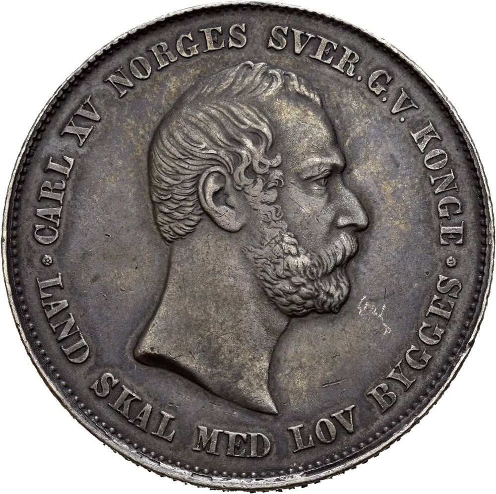 Опис: Бюст короля Карла XV, звернений вправо. Оточений написом. На обідку — перлинне кільце.
