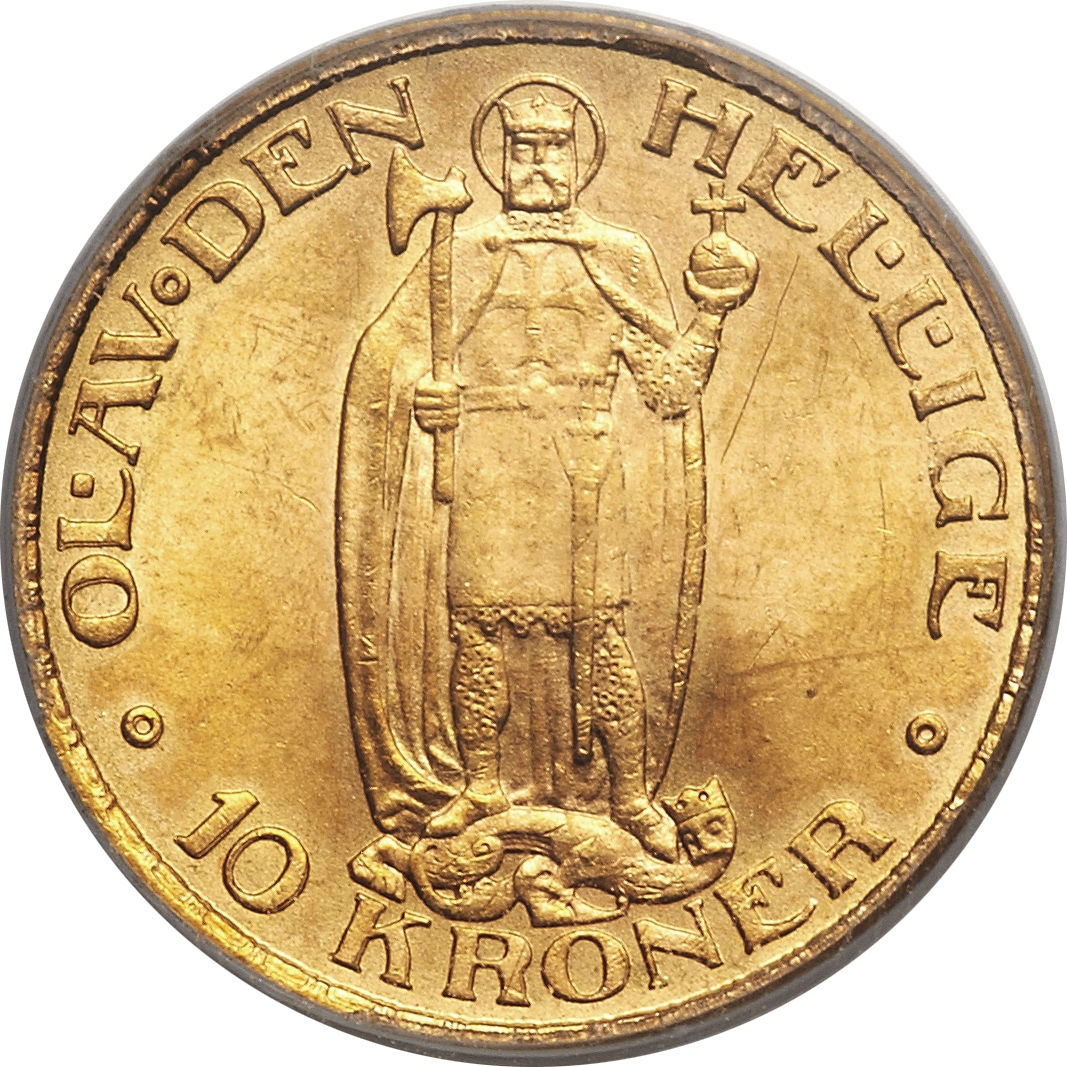 Опис: Зображення святого Олафа з німбом, який тримає сокиру та глобус, стоячи на драконі з людською головою. Напис навколо та номінал внизу. Кільце з віночком на обідку.