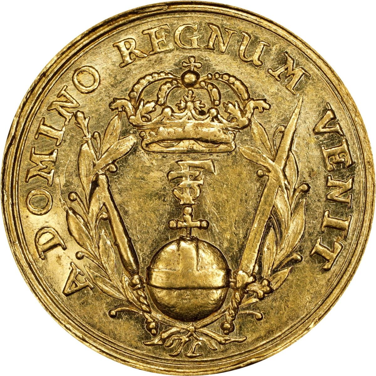 Опис: Коронований монограм над яблуком між мечем і скіпетром, всередині вінка. Оточений написом. Суцільне кільце на краю.