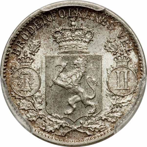 Опис: Коронований прямокутний щит із коронованим норвезьким левом, що тримає алебарду і дивиться вліво, на тлі вертикальних ліній, всередині щита. Короновані монограми O та II з горизонтальними лініями на тлі всередині кіл, по обидва боки герба та над гілками вінка. Напис над короною. На обідку — кільце з намистинами.