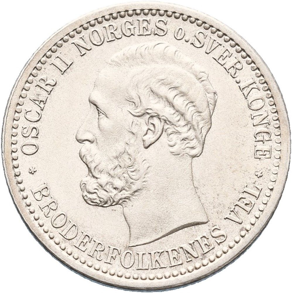 Опис: Бюст короля Оскара II, звернений вліво. Оточений написом. На обідку — кільце з намистинами.