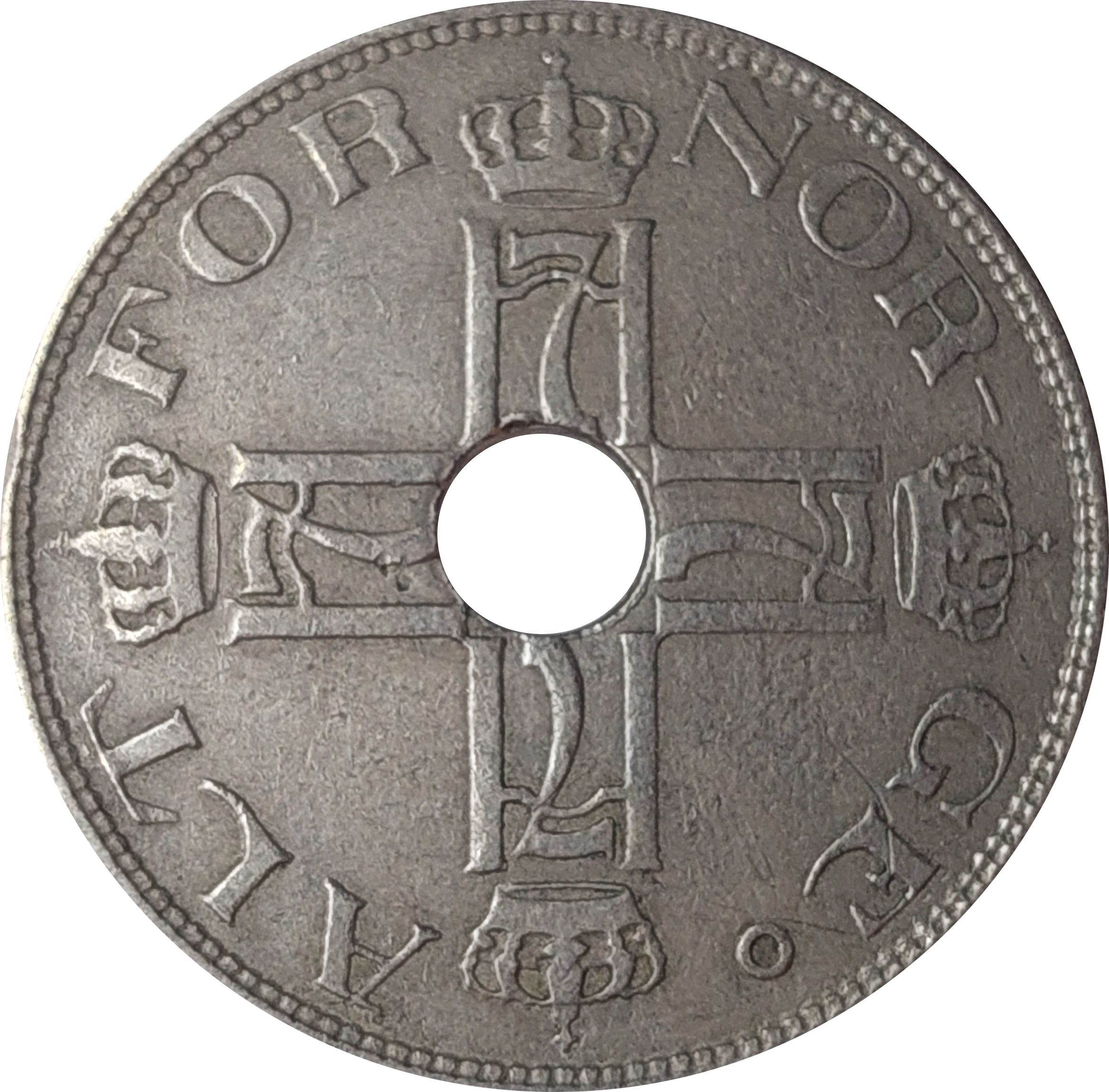 Опис: Коронований щит із коронованим норвезьким левом, що тримає алебарду і дивиться вліво, з отвором посередині. Номінал під щитом. Трискеліон з кожного боку щита. Дата ліворуч від номіналу. Монетний знак праворуч від номіналу. На обідку — кільце з намистинами.