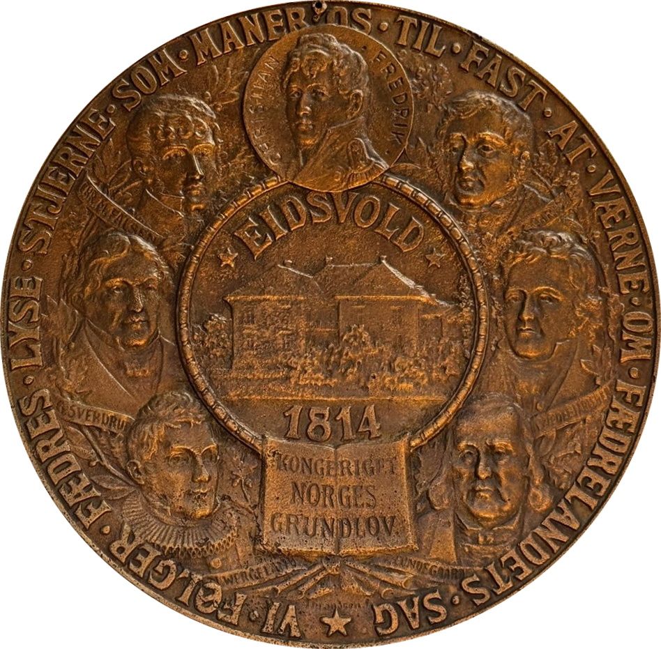 Опис: Будівля Ейдсволл серед дерев з написом зверху та датою знизу, в облямованому кільці. Погруддя (зліва направо): Ніколай Вергеланд, Георг Свердруп, Крістіан Магнус Фальсен, Крістіан Фредерік, Вільгельм Фріманн Корен Крісті, Герман Ведель Ярлсберг. Їхні імена вказані на банерах під кожною особою, крім Крістіана Фредеріка, ім'я якого оточує його суцільним кільцем. Відкрита книга з написом під датою. Листя і вінки розкидані навколо бюстів, всі вони оточені іншим написом.