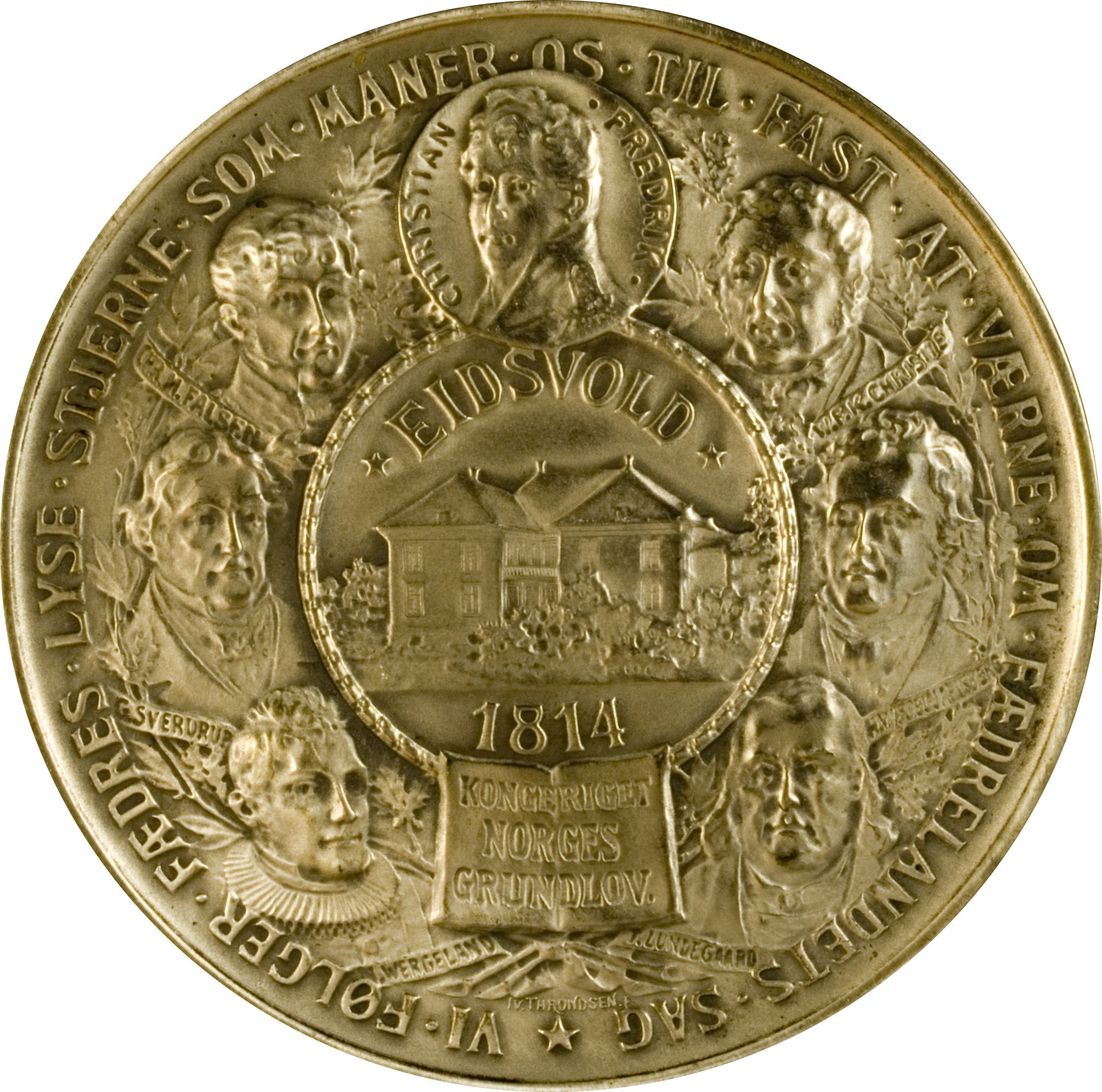 Опис: Будівля Ейдсволл серед дерев з написом зверху та датою знизу, в облямованому кільці. Погруддя (зліва направо): Ніколай Вергеланд, Георг Свердруп, Крістіан Магнус Фальсен, Крістіан Фредерік, Вільгельм Фріманн Корен Крісті, Герман Ведель Ярлсберг, Тейс Лундегаард. Їхні імена вказані на банерах під кожною особою, крім Крістіана Фредеріка, ім'я якого оточує його суцільним кільцем. Відкрита книга з написом під датою. Листя і вінки розкидані навколо бюстів, всі вони оточені іншим написом.