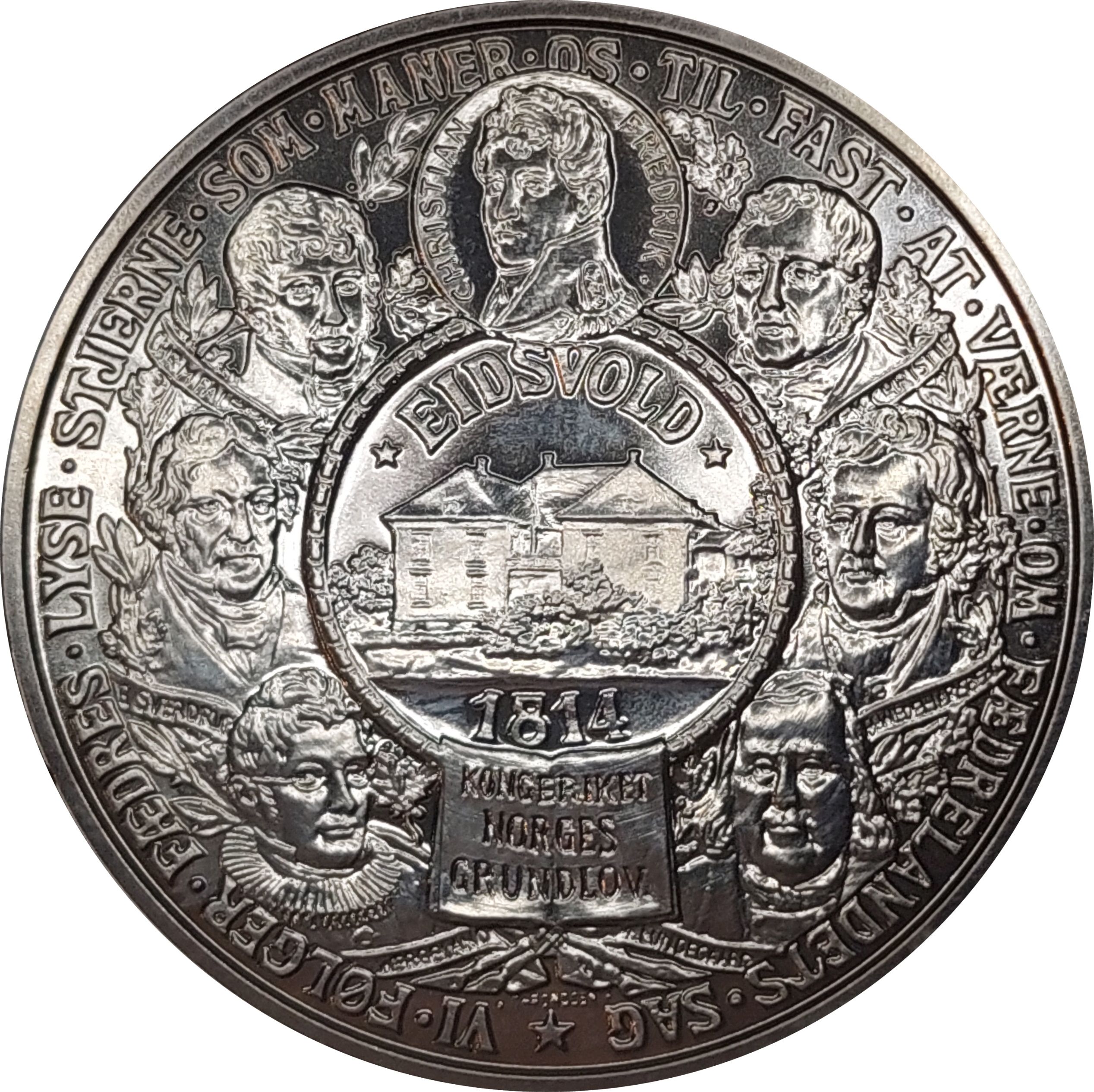 Опис: У центрі: Будівля Ейдсволл (зліва направо) Портрети: Ніколай Вергеланд, Георг Свердруп, Крістіан Магнус Фальсен, Крістіан Фредерік Вільгельм Фріманн, Корен Крісті, Герман Ведель, Ярлсберг, Тейс Лундегаард. Їхні імена на банерах під кожною особою, крім Крістіана Фредеріка, оточені його зображенням.
