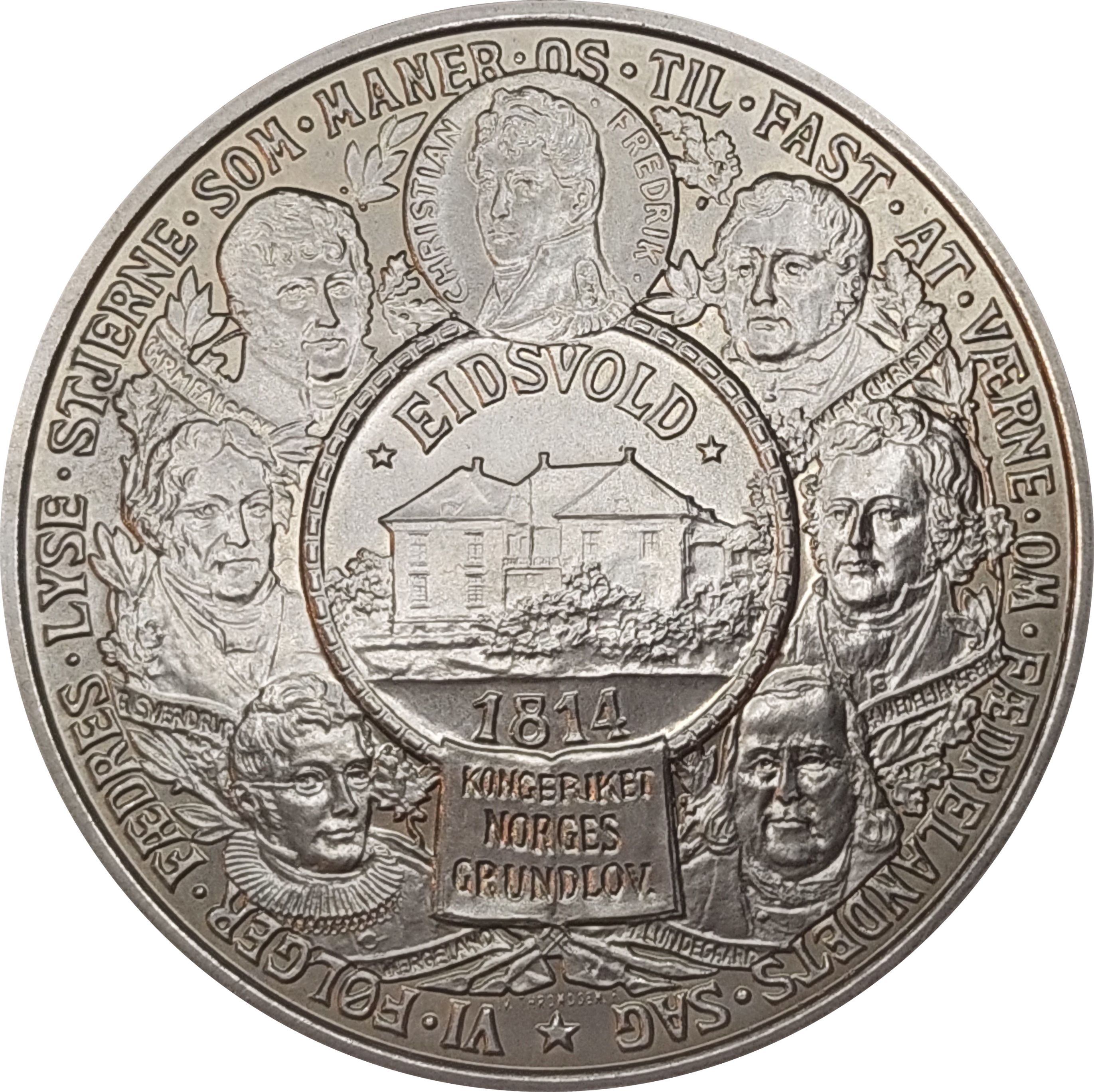 Опис: У центрі: Будівля Ейдсволл (зліва направо) Портрети: Ніколай Вергеланд, Георг Свердруп, Крістіан Магнус Фальсен, Крістіан Фредерік Вільгельм Фріманн, Корен Крісті, Герман Ведель, Ярлсберг, Тейс Лундегаард. Їхні імена на банерах під кожною особою, крім Крістіана Фредеріка, оточені його зображенням.