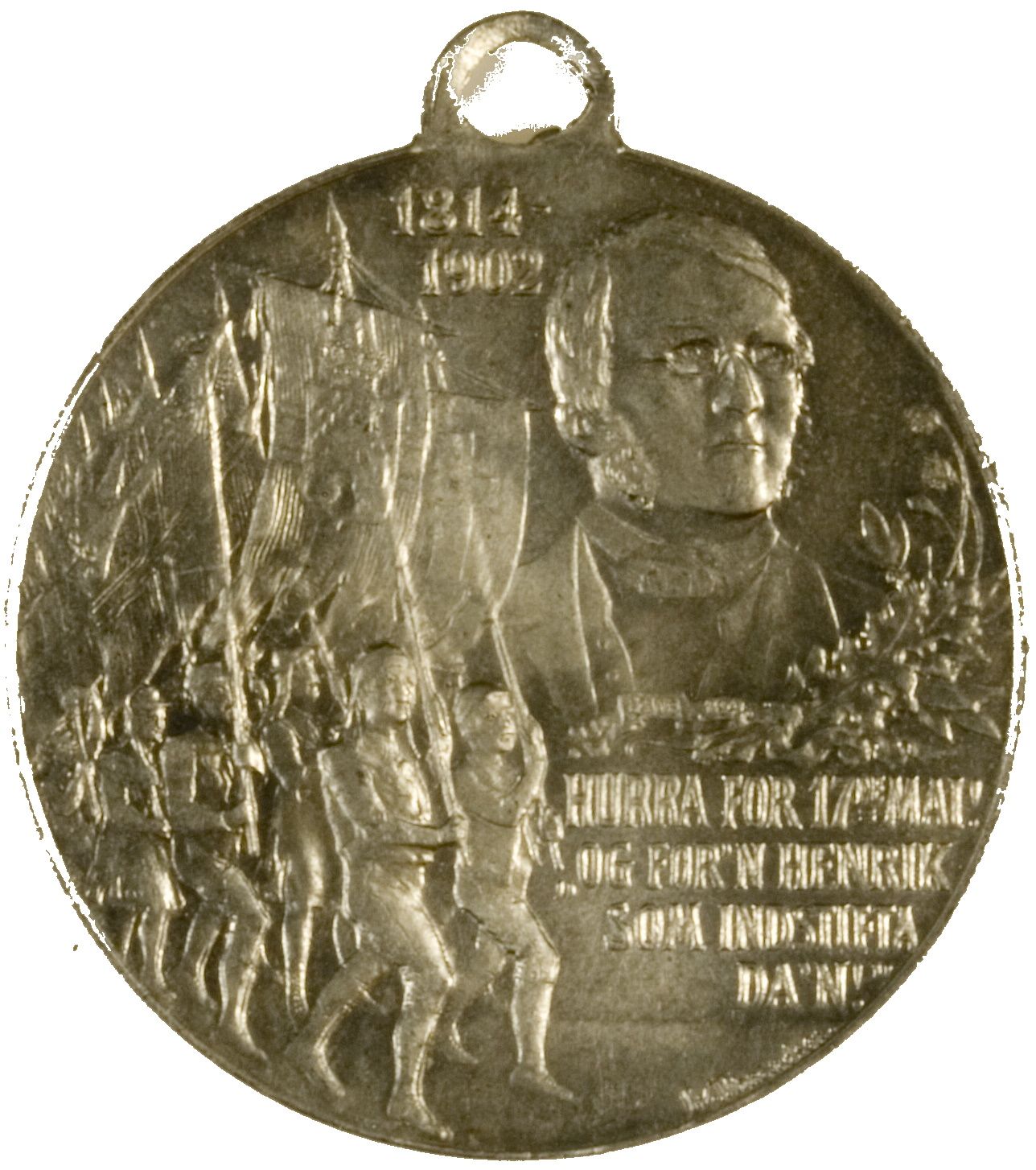 Опис: Портрет Генріка Вергеланда, лавровий гілок і люди, що марширують з прапорами.