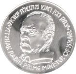 Опис: Бюст Іцхака Рабіна, звернений вліво, оточений написом, суцільне кільце на обідку.