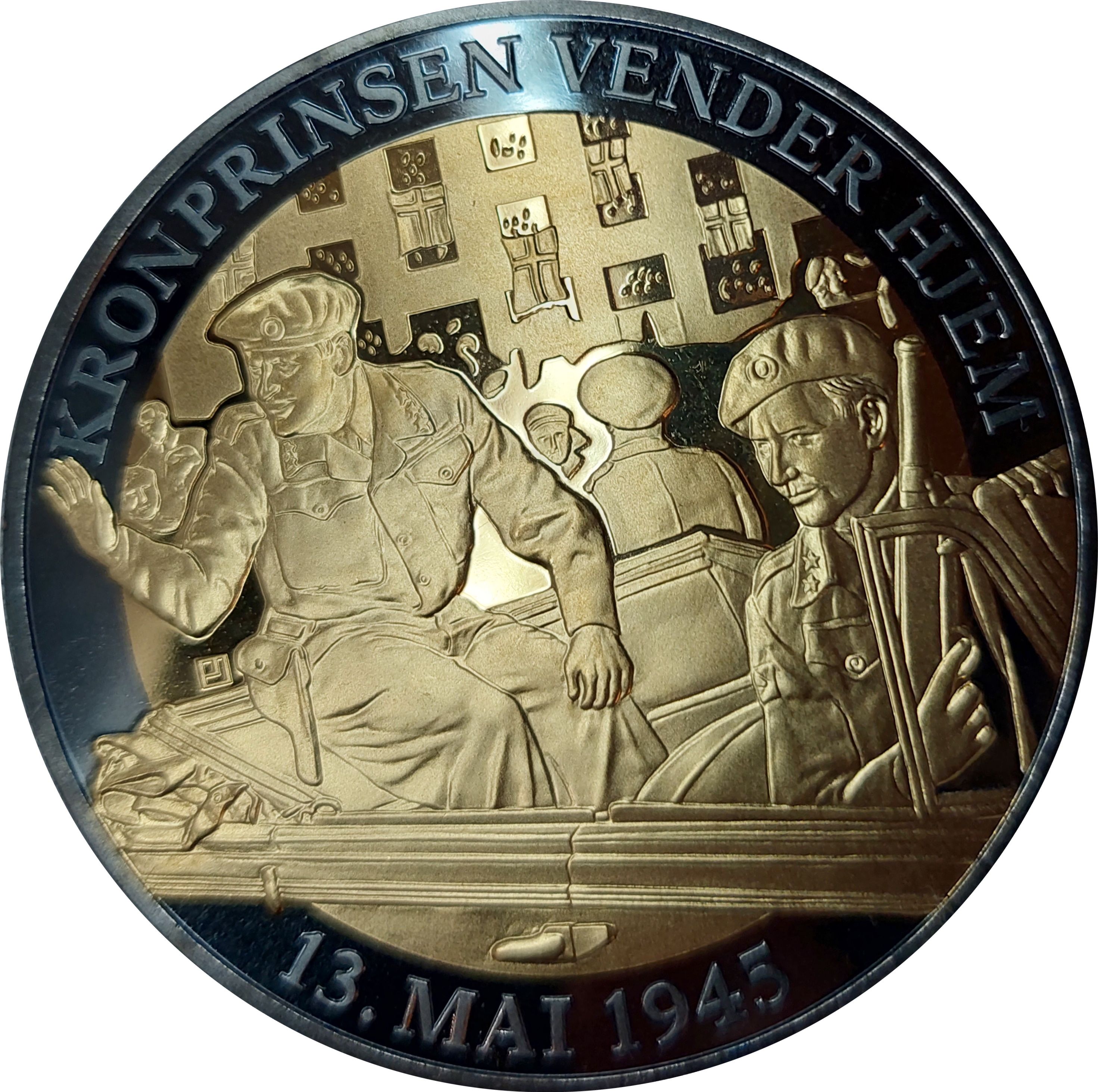 Опис: Кронпринц Олав і Макс Манус на автомобілі під час визволення Осло в 1945 році. На тлі — норвезькі прапори, оточені написом зверху і знизу.