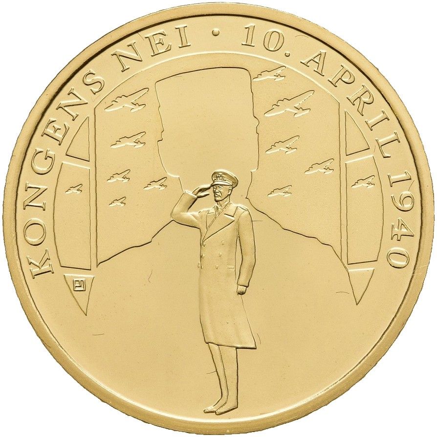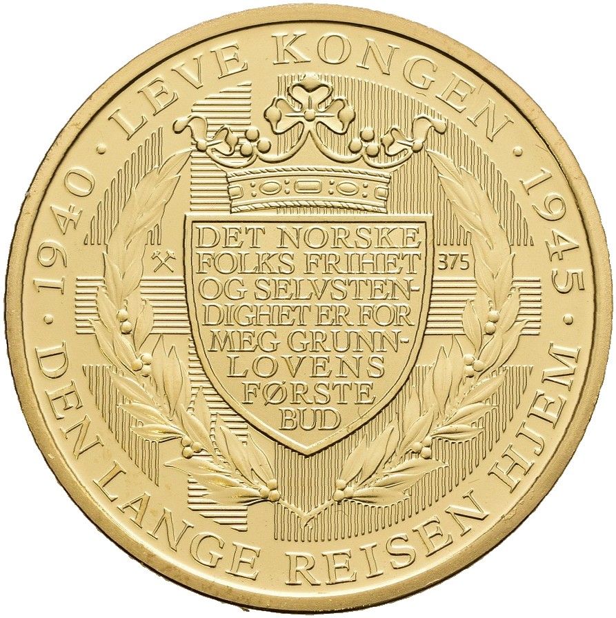 Опис: Король Гакон VII, що вітає, обернений ліворуч, його силует і літаки на тлі. Все в суцільному кільці, оточеному написом.