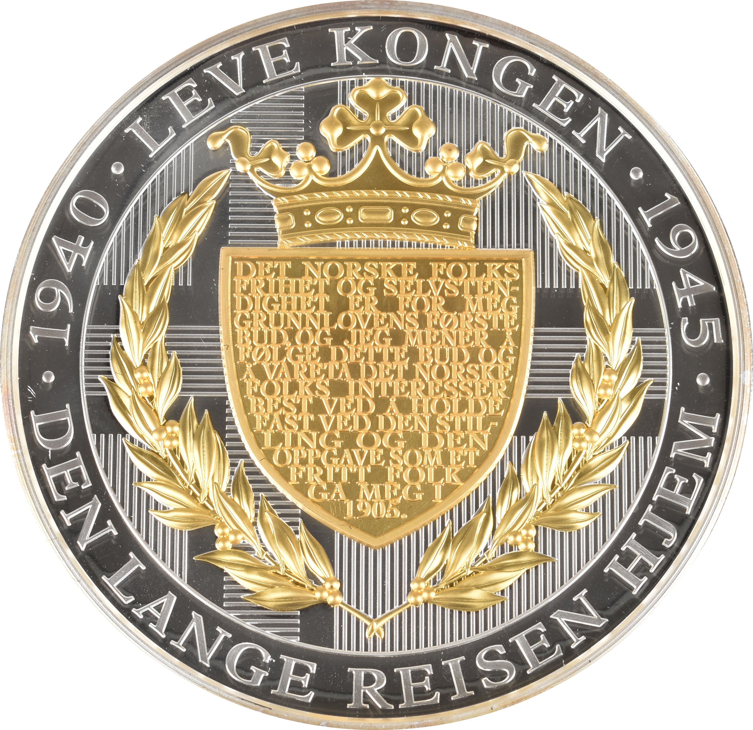 Опис: Король Гакон VII, що вітає, обернений ліворуч, його силует і літаки на тлі. Все в суцільному кільці, оточеному написом.