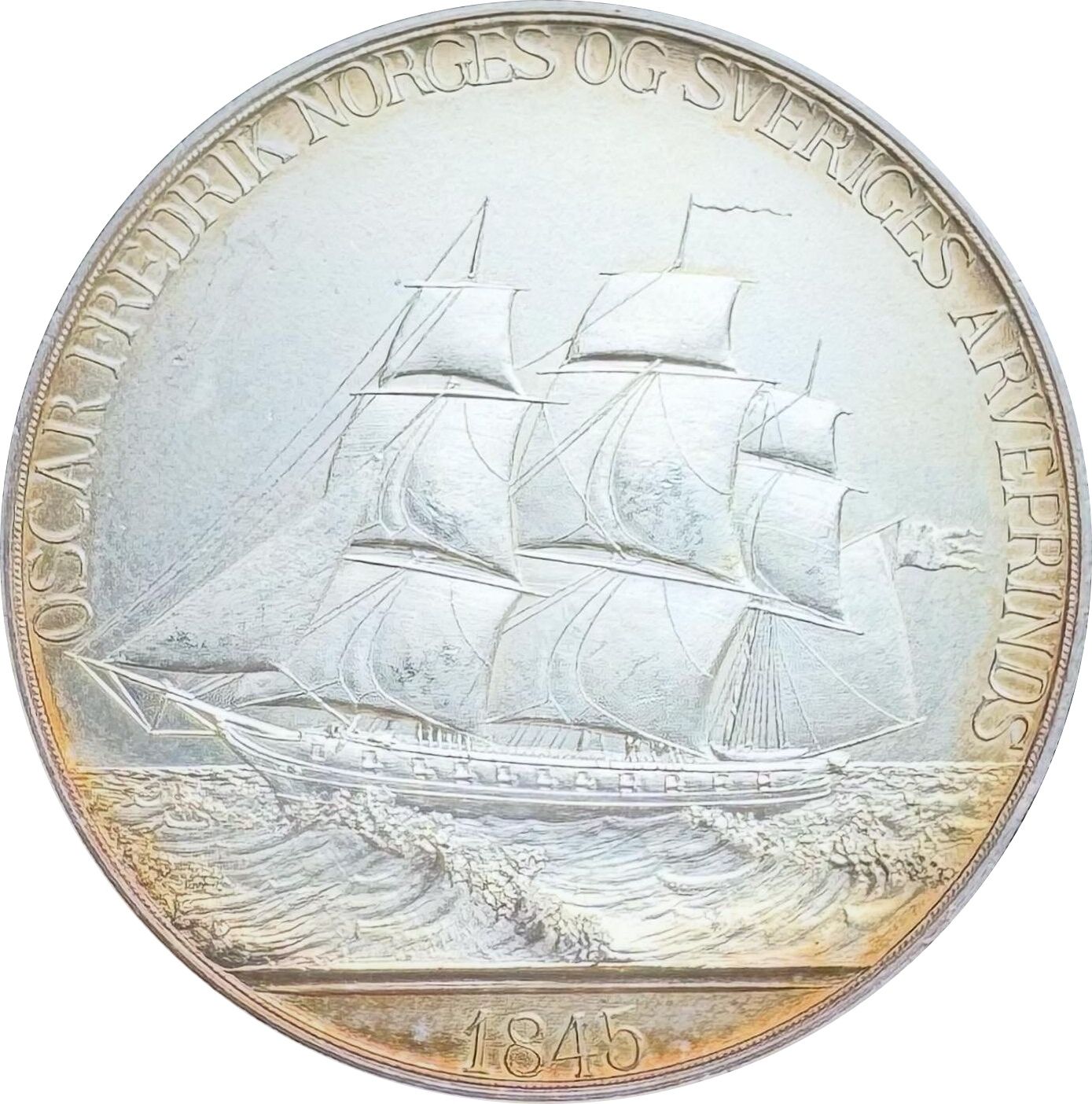 Опис: Погруддя Оскара II, звернене вліво, оточене написом. Підпис на шиї погруддя, кільце з бусинками по краю.