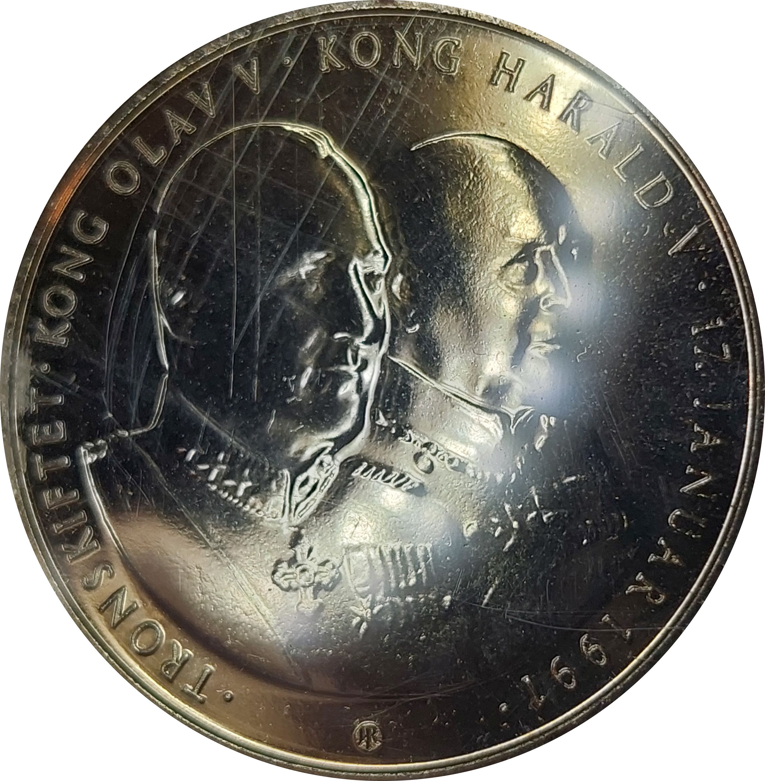 Опис: Портрети Харальда V та Олава V, звернені вправо, оточені написом.