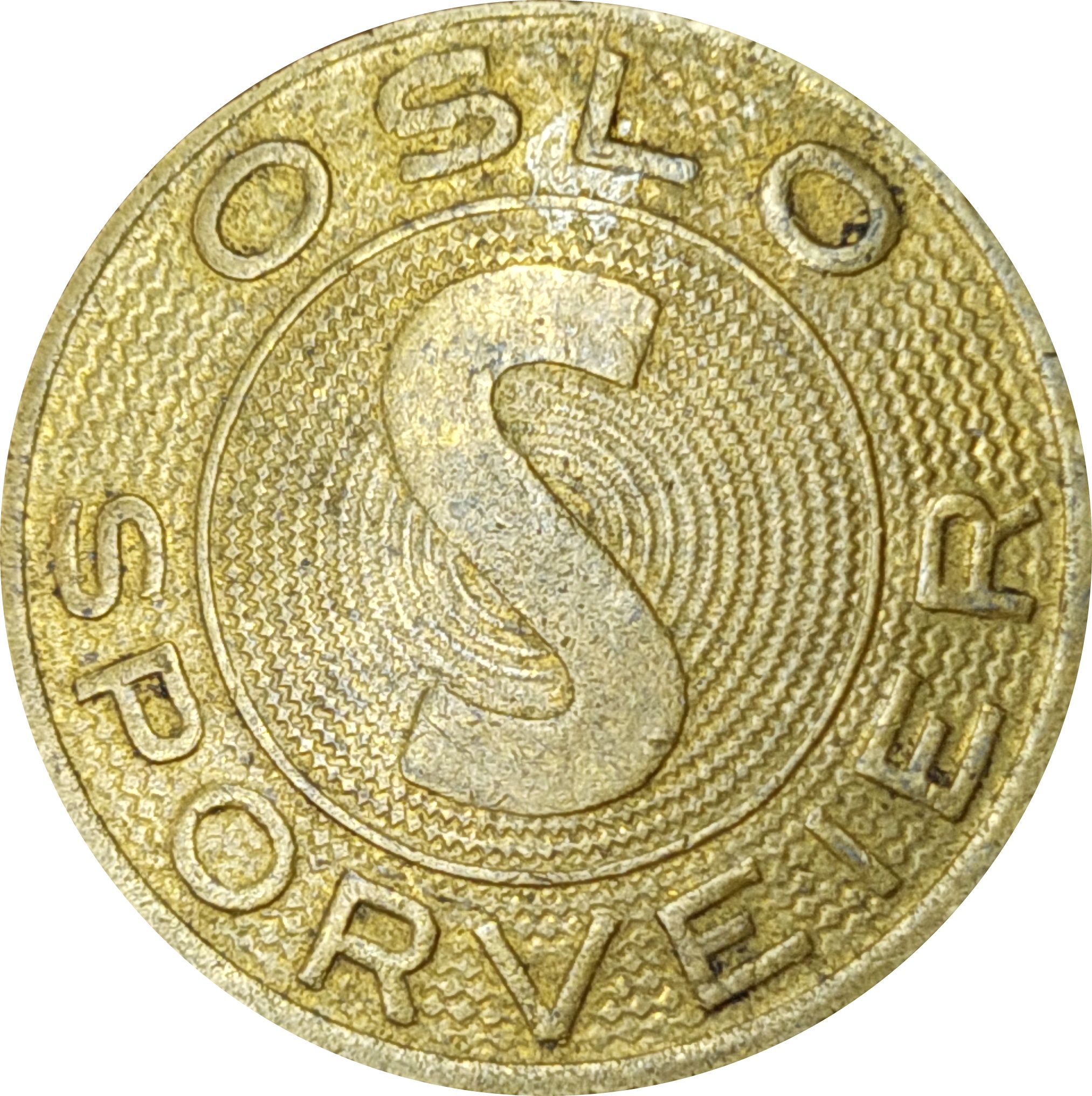 Жетон — Трамваї Осло (латунь; без вирізу; спіральний фон) 1929 – 1967 Норвегія