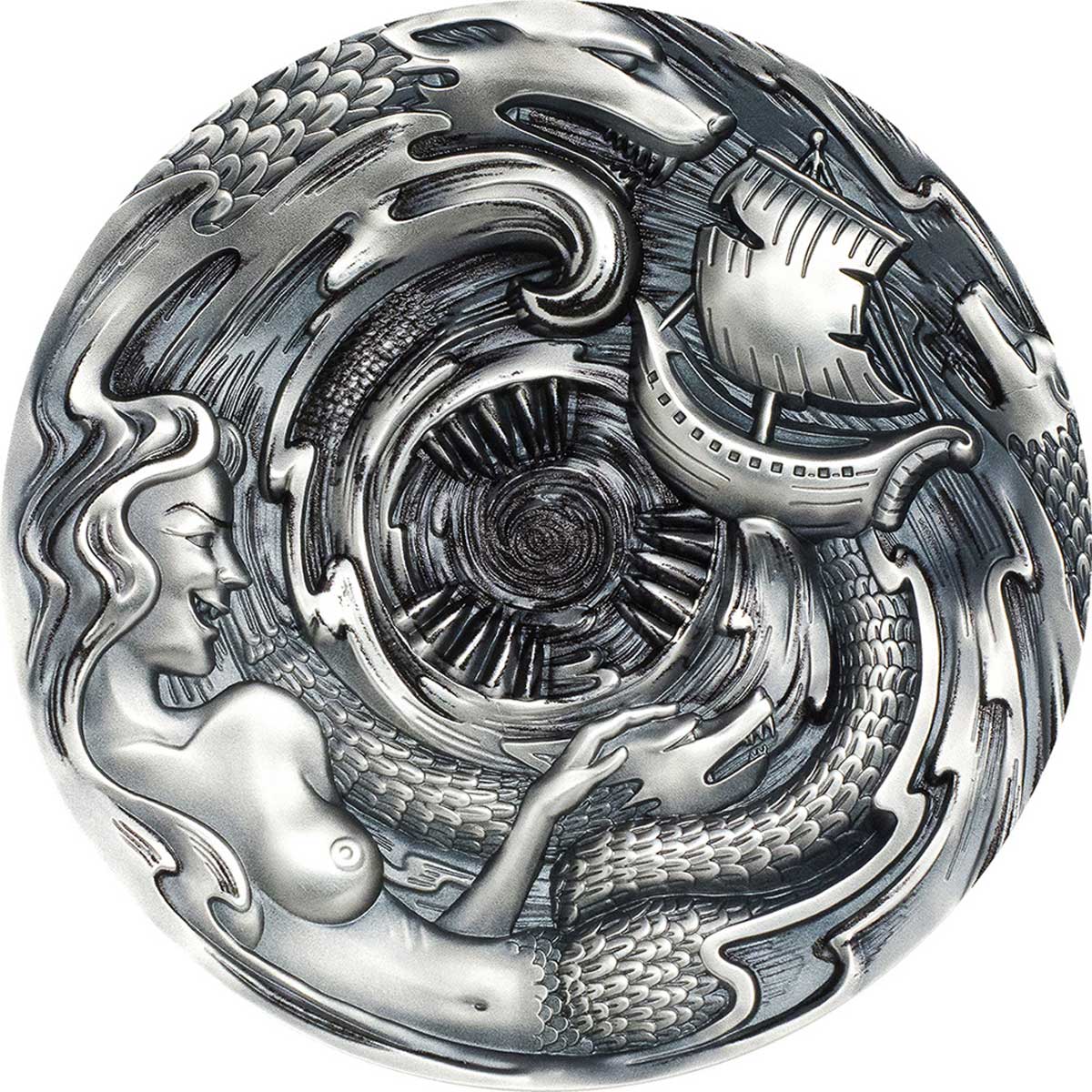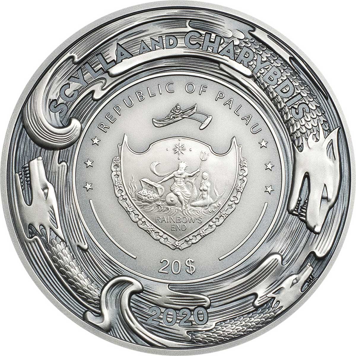 Опис: Човен, що пливе між Сциллою та Харибдою. Сцилла була морським чудовиськом на калабрійському боці протоки, а Харибда — виром біля узбережжя Сицилії. Морське чудовисько охоплює весь малюнок, проходячи від реверсу до аверсу монети.