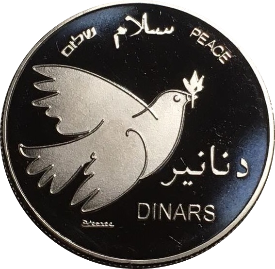 Опис: Голуб миру Пабло Пікассо зі словом «Мир» англійською, арабською та івритом. «Динари» арабською та англійською без номінальної вартості. Підпис Пікассо під голубом.